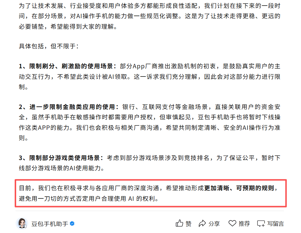 On December 5, the Doubao team announced that, to ensure a harmonious balance between technological advancement and industry acceptance, they would be implementing "standardized adjustments" to the AI's mobile phone operational capabilities. This includes limiting the use of financial apps and certain games.
