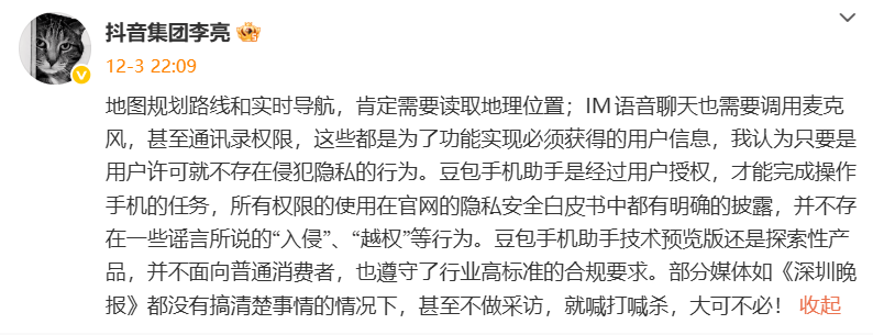 Shortly thereafter, numerous industry insiders criticized Doubao for obtaining a high-risk operating system permission known as INJECT_EVENTS, which enables its cross-app operational capabilities. This prompted a public statement from Li Liang, Vice President of Douyin, who stated, "As long as users grant permission, there is no privacy infringement. The Doubao Mobile Assistant can only perform tasks on the phone with user authorization."