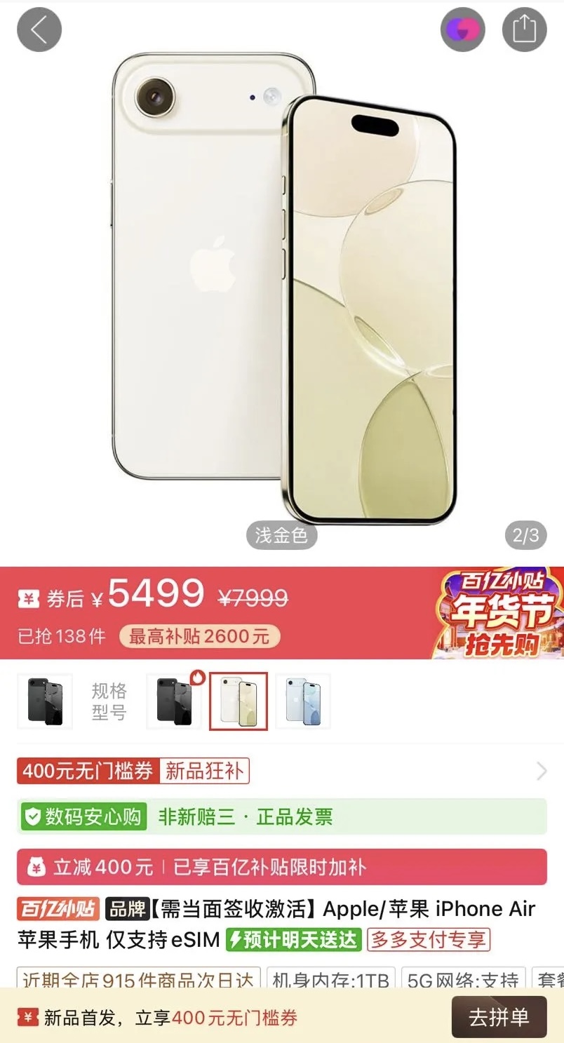 It's noteworthy that Pinduoduo's participation in the 10 billion subsidy program suggests that the iPhone Air may maintain a price point around 5000 yuan or even be pushed lower in third-party channels.