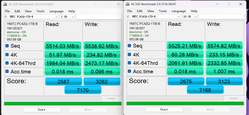 The 1GB capacity test in AS SSD Benchmark yielded a score of 7170 for the PC42Q 1TB. Sequential read/write speeds were 5514MB/s and 5538MB/s, respectively, while 4K read/write speeds were 51MB/s and 234MB/s.