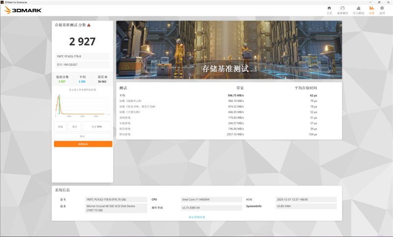 The 3DMark storage test primarily evaluates gaming read/write performance. The PC42Q 1TB scored 2927 points with a latency of 62 microseconds and a mobile gaming bandwidth of 2557MB/s.