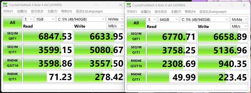 For the 64GB test, sequential read speeds reached 6770MB/s, write speeds 6658MB/s, 4K random read speeds 49MB/s, and write speeds 223MB/s.