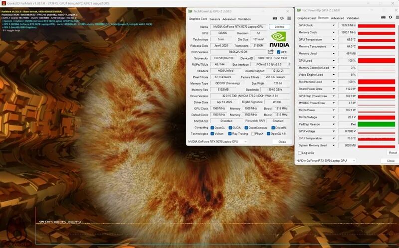 During dual burn-in, the CPU temperature was 70 degrees Celsius, and the GPU temperature was 63 degrees Celsius.
