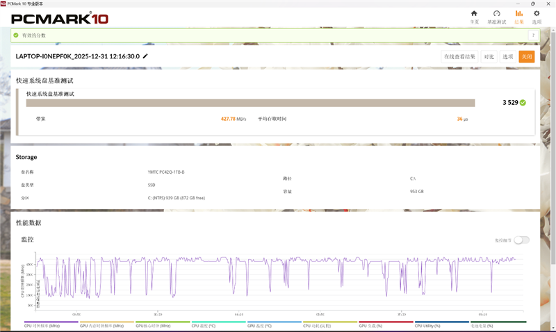 The PCMark 10 Fast System Disk Benchmark yielded a score of 3529 points, with a bandwidth of 427MB/s and an average access time of 36 microseconds.