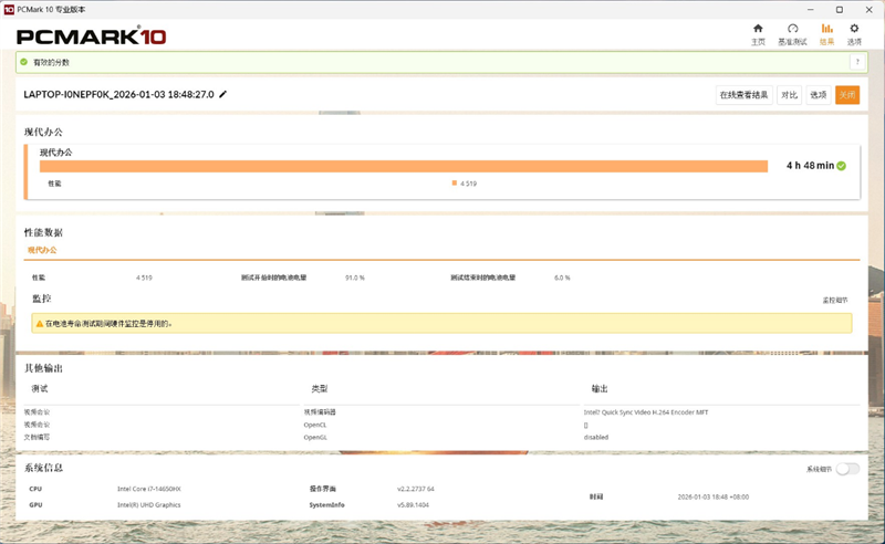 The battery life test result in the PCMark 10 Modern Office scenario reached 4 hours and 48 minutes, which is acceptable for a gaming laptop.