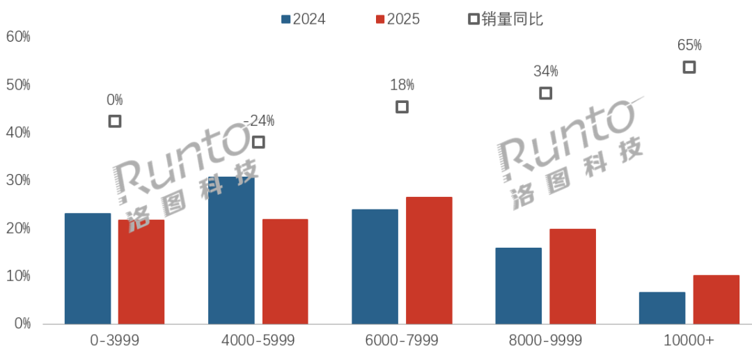 In contrast, the 4,000–5,999 yuan segment—last year’s largest—plummeted 24% YoY, with its share dropping 9 percentage points to 22%.