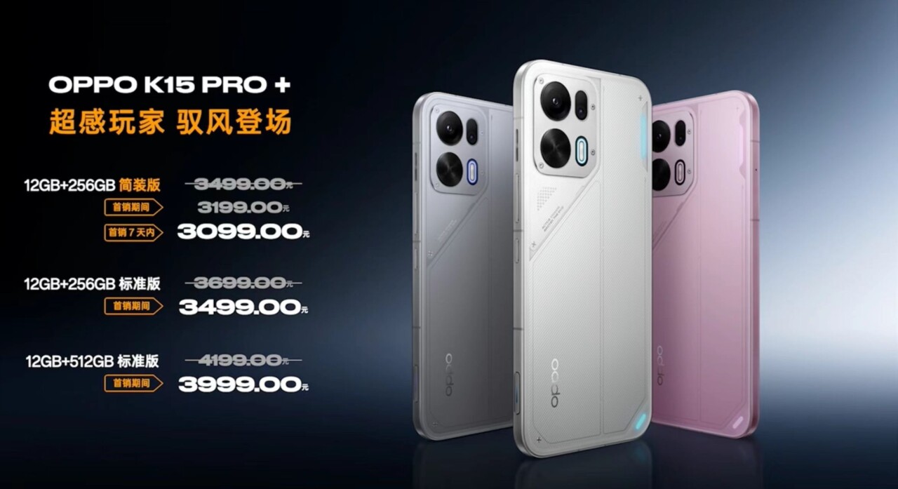 Regarding pricing, the OPPO K15 Pro+ is available in three configurations. The 12GB+256GB (Basic Version) starts at 3199 yuan, the 12GB+256GB (Standard Version) is priced at 3499 yuan, and the 12GB+512GB variant begins at 3999 yuan.