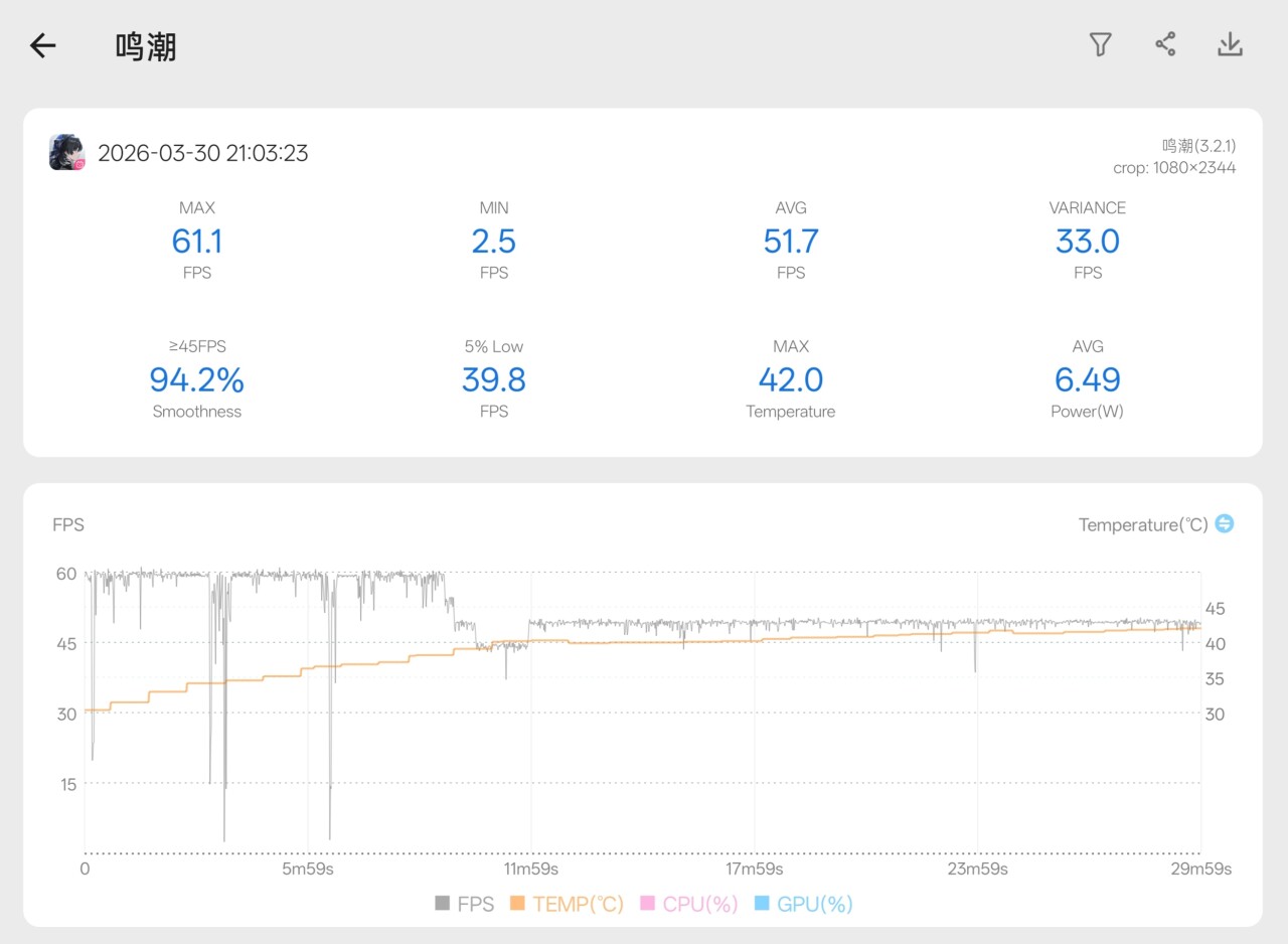 While exploring and fighting monsters on the large map, the average frame rate stayed stable at around 60 FPS, with the device temperature in the forties. But as soon as I entered the Astral Torch Academy and started riding my motorcycle, power consumption spiked, and after a while, it locked at around 50 FPS, ending with an average frame rate of 51.7 FPS.