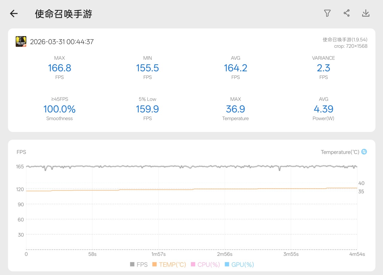 Next up, a shooting game: Call of Duty: Mobile. With the fan on full blast, the average frame rate hit 164.19 FPS. For mainstream mobile games with medium to low loads, the OPPO K15 Pro+ handles them smoothly, fully utilizing the refresh rate.