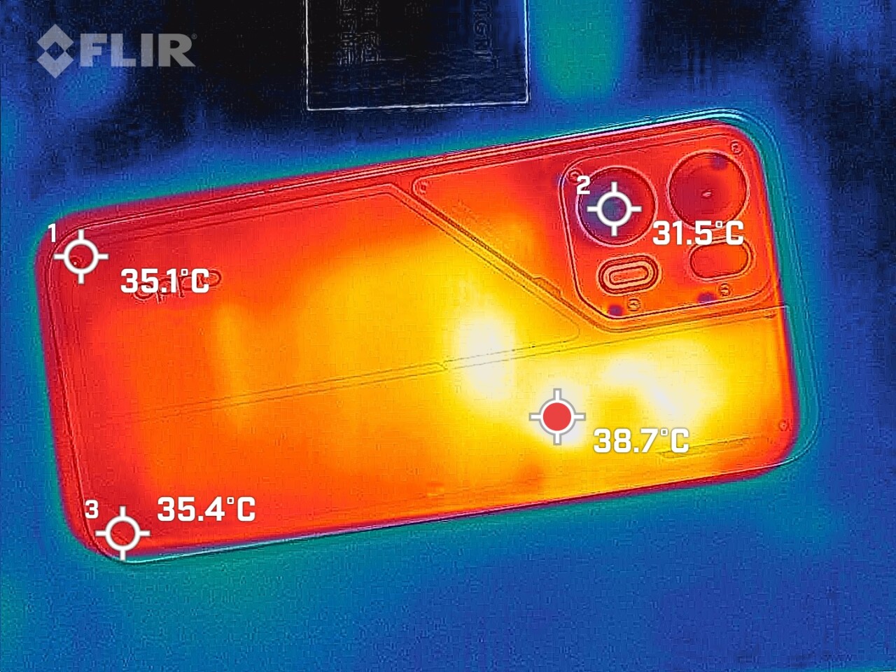However, the temperature wasn't as low as one might hope. After half an hour of LOLM, the highest temperature was near the Deco area, reaching 38.7°C, not much different from devices with the same chip but no fan...