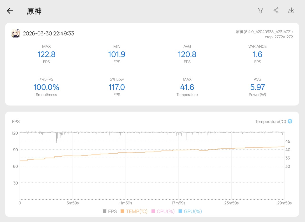 Guess what? The frame rate was quite stable this time. After half an hour, the average frame rate reached 120.81 FPS, with the 5% low frame rate at 117 FPS. However, the overall device temperature was higher, approaching 39.5°C, even slightly higher than devices in the same category without fans.