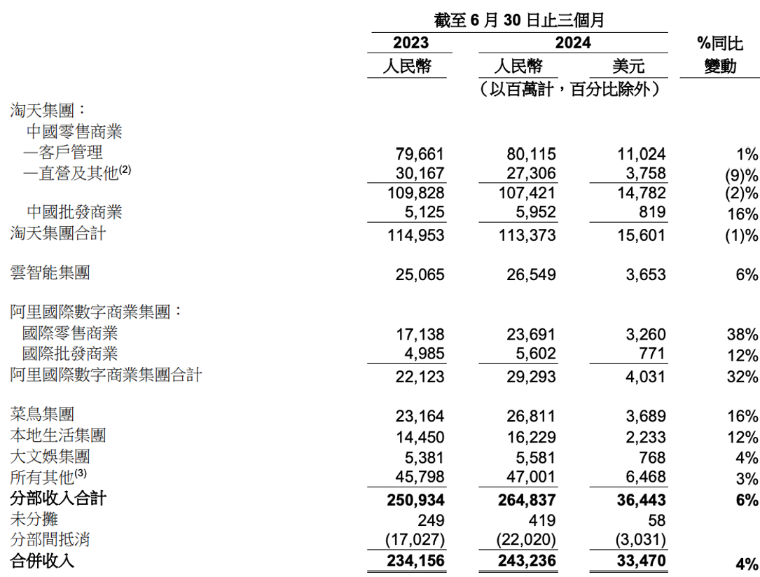 In terms of business scale, Taobao and Tmall, international business, Cainiao, intelligent cloud services, local services, and digital media and entertainment were Alibaba's top performers in Q2 2024. However, in terms of growth rate, international business, Cainiao, local services, and intelligent cloud services led the way. International retail commerce grew by 38% YoY in Q2, while intelligent cloud services grew by 6%, both outpacing the overall growth rate of 4%.