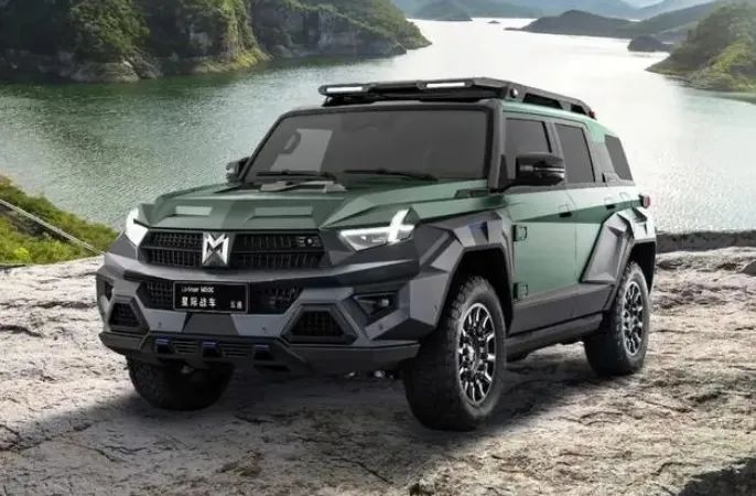 The Dongfeng Mengshi M800 Starship is based on the current Mengshi 917 model. The new vehicle features a composite carbon fiber armored body, offering lightness, strength, premium quality, and luxury. Its front design highlights a futuristic aesthetic, complete with custom spotlights on the roof and angular wheel arches, exuding a rugged charm.