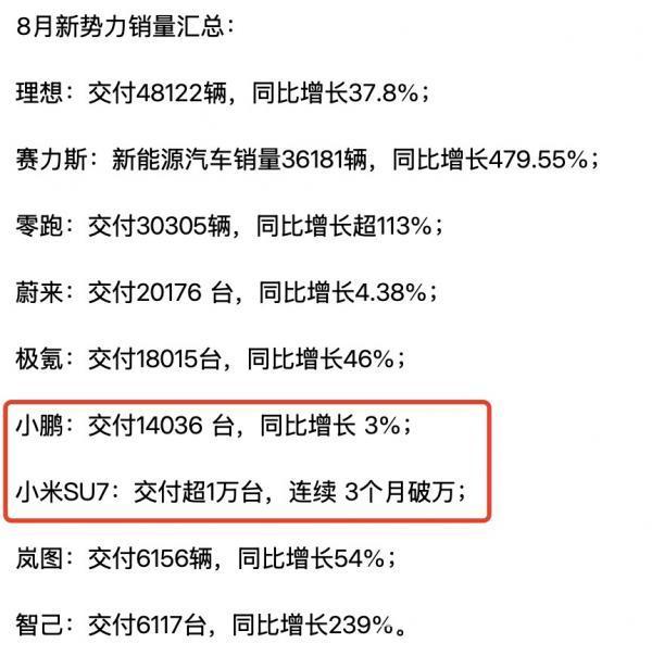 Image/August 2024 Sales of XPeng and Xiaomi