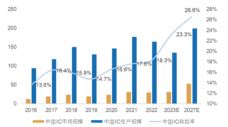 China's IC Market Size, Production Scale, and Self-Sufficiency Rate (in billions of US dollars)