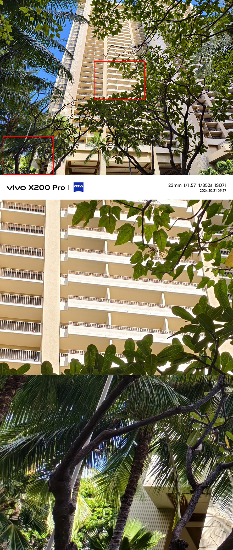 In terms of imaging quality, the main camera of the X200 Pro is quite solid. For example, in the following image, the central building is illuminated by light and stands out in the highlight area of the photo, while the trees in the corners appear darker due to backlighting. However, upon zooming in, one will find that both the building and the trees are rendered sharply and cleanly.