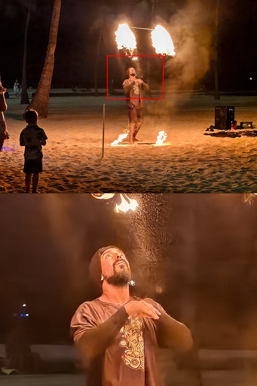 Next is a night photo taken with the telephoto lens at its native 85mm focal length. The scene is primarily illuminated by torches held by performers, creating a high-contrast environment with low brightness. The shutter speed was 1/381s, and the ISO was as high as 20492. Even when the photo is magnified to 100%, facial expressions and clothing patterns remain clear, demonstrating impressive performance.