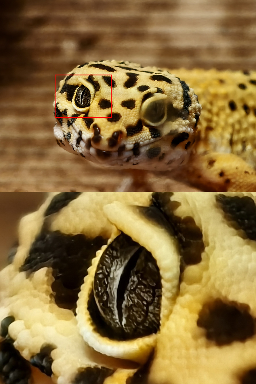 The last photo is a 20X macro mode snapshot with a shutter speed of 1/298s and an ISO of 5552. When magnified to 100% to observe the lizard's eyes, the details remain clear even through the glass.