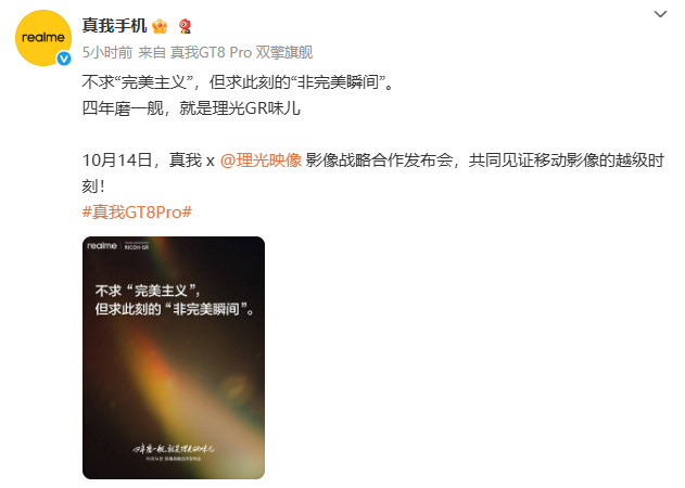 Today, the official announcement confirmed that the launch event for the realme GT8 Pro is scheduled for October 14th, and the imaging brand partner has been officially revealed. Interestingly, the collaboration between realme and Ricoh actually commenced four years ago. Building on years of technical cooperation, the GT8 Pro will serve as the inaugural platform to showcase their combined imaging technology. This likely underpins realme's bold claim that the GT8 Pro will deliver unparalleled imaging capabilities.