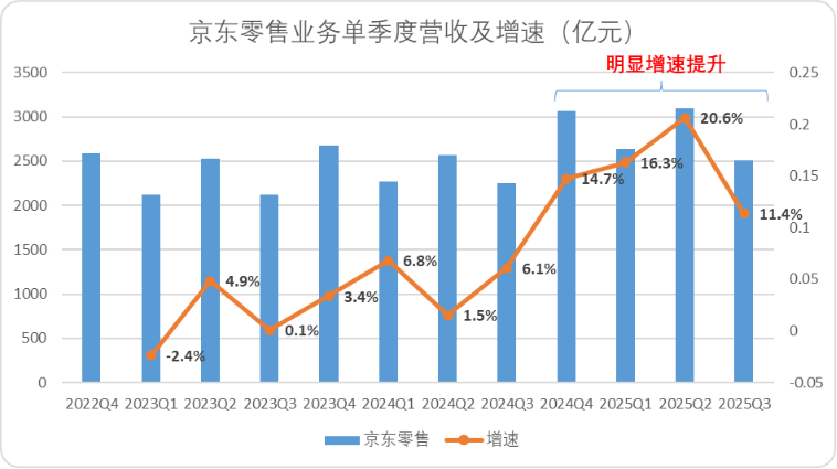 On the surface, JD's retail business has shown impressive growth this year: revenue growth rates for the first three quarters were 16.3%, 20.6%, and 11.4%, respectively, jumping from single-digit to double-digit percentages compared to the past.