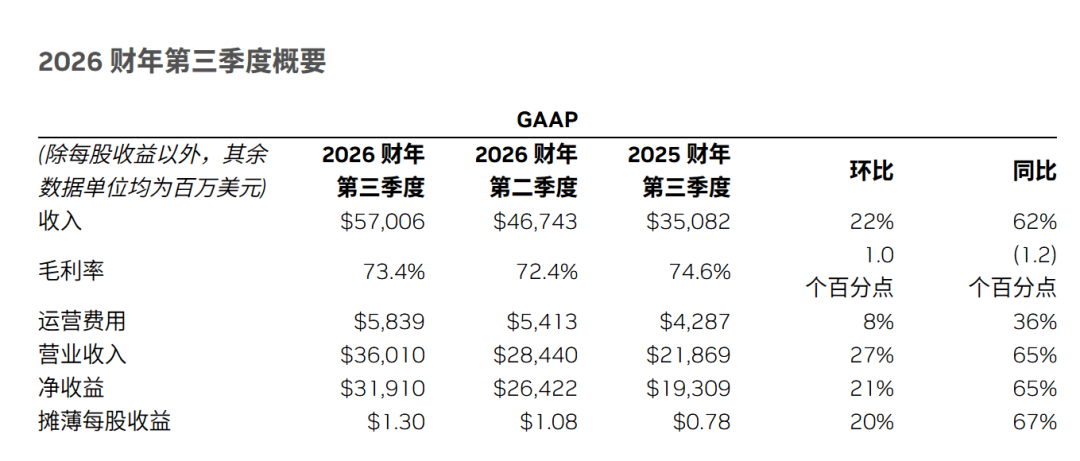 In the third quarter of fiscal year 2026, its revenue surged to 57 billion USD, a 62% year-over-year increase; adjusted net profit reached 31.9 billion USD, a 65% year-over-year increase. Both core indicators significantly exceeded Wall Street expectations, providing a strong rebuttal to the rising 'AI bubble theory' in public opinion.