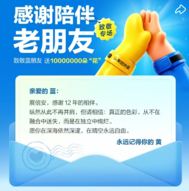 In early November 2025, Ele.me officially announced its rebranding as 'Taobao Flash Delivery,' fully integrating into Alibaba's 'Grand Consumption Platform' strategic ecosystem. Surprisingly, its long-standing rival Meituan swiftly launched a 'Tribute' button at the bottom of its app, accompanied by an image of yellow and blue gloves clapping, along with an open letter titled 'A Tribute to Our Blue Friends': 'Thank you for 12 years of companionship. Even though we no longer walk side by side, true colors never fade in integration. May you remain profound in the depths.'