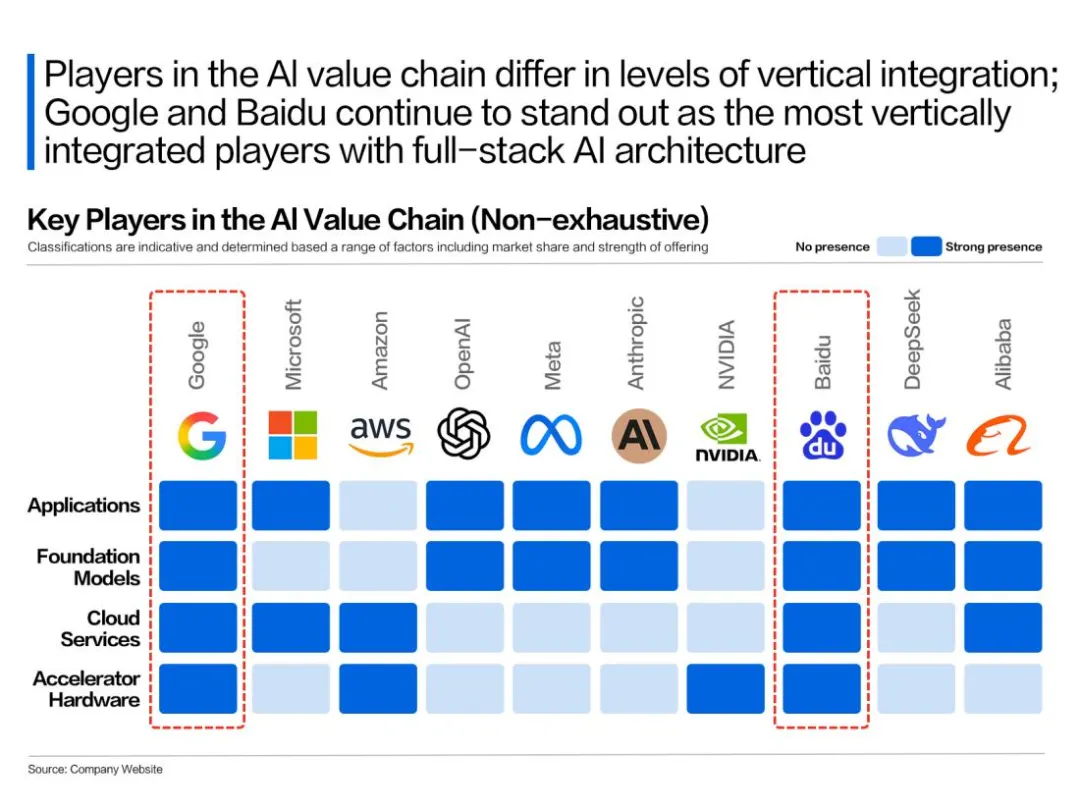 Based on this, the 'Googles' possess full-stack AI capabilities spanning chips, models, frameworks, and applications, giving them a favorable position in search competition.