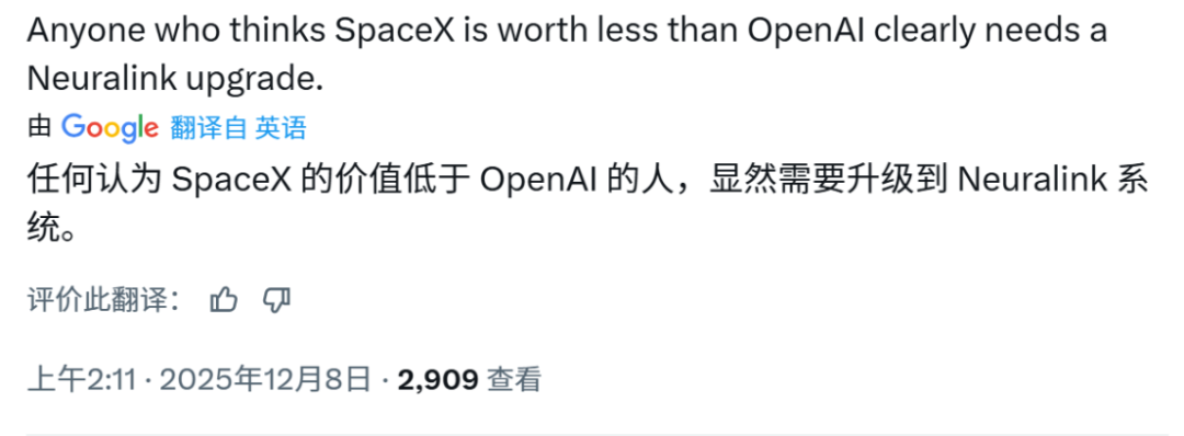 One user remarked that anyone valuing SpaceX below OpenAI clearly needs a brain-machine interface upgrade.