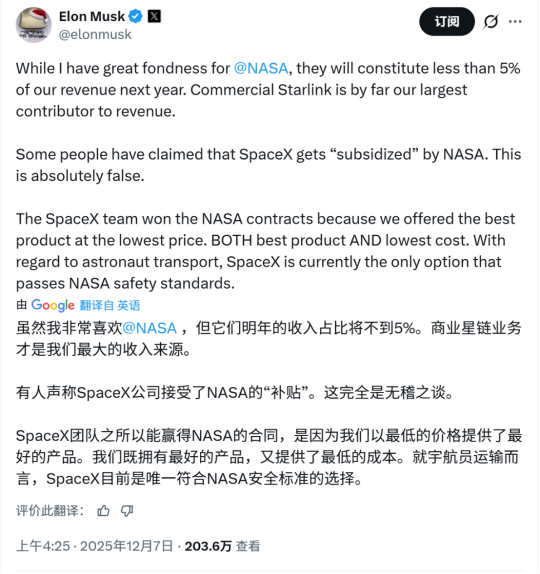 However, Musk recently refuted on Twitter claims that SpaceX relies on NASA contracts for business. He noted that NASA orders will account for just 5% of revenue in 2026, with the commercial Starlink business being the key driver.