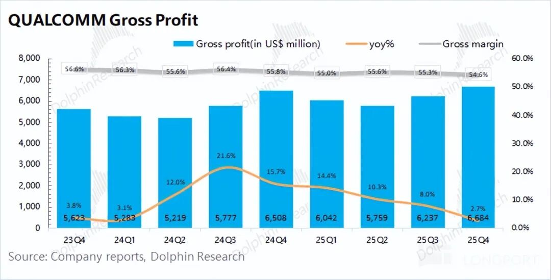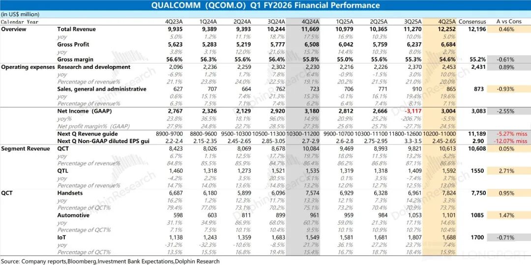 1. Core Financial Data: Qualcomm reported quarterly revenue of $12.25 billion, up 5% year-over-year, aligning with market expectations of $12.2 billion. However, the company's growth rate slowed significantly this quarter, primarily due to the sluggish downstream smartphone market. The gross margin stood at 54.6%, down 1.2 percentage points year-over-year and below market expectations of 55.2%. The storage shortage dragged down the gross margin of Qualcomm's hardware business (QCT).