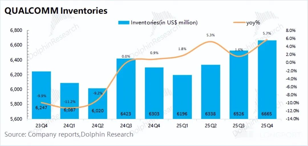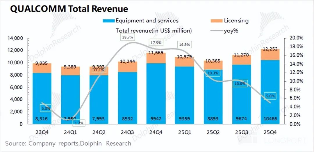 For the slowdown in the company's smartphone business growth this quarter, Dolphin Research believes there are two main reasons: ① The company brought forward the release of its flagship product, the Snapdragon 8 Elite Gen5, to the previous quarter. ② The overall industry performance of the smartphone market was sluggish.