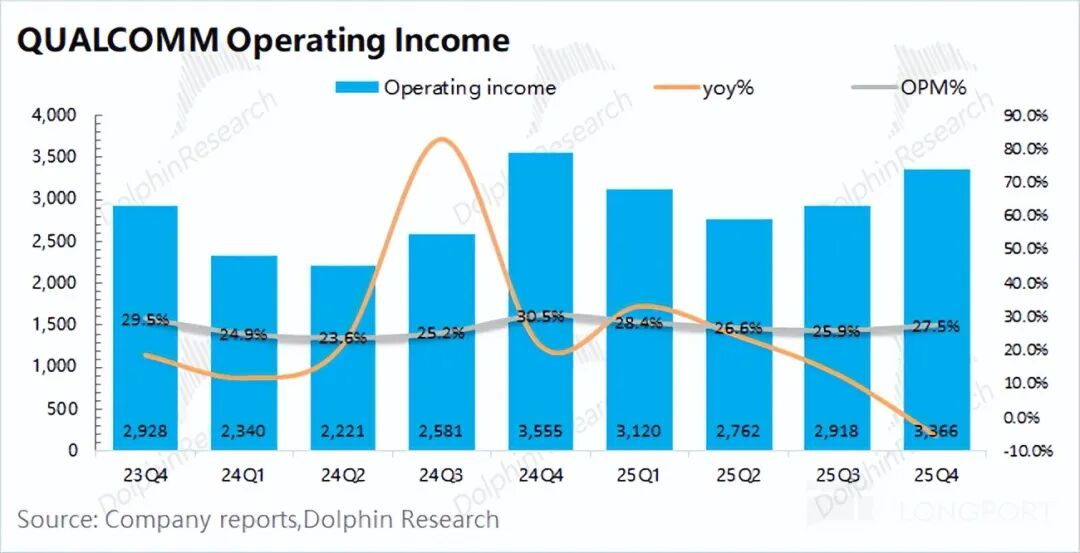 Due to the decline in gross margin and the increase in operating expenses, Qualcomm's core operating profit for the quarter was $3.37 billion, down 5% year-over-year.