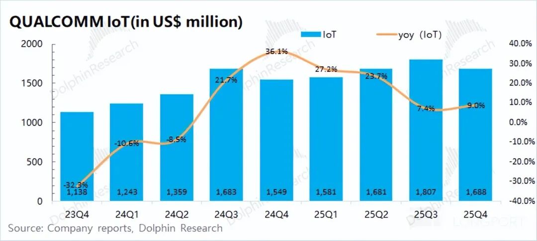 In the first quarter of fiscal year 2026 (i.e., the fourth quarter of 2025), Qualcomm's IoT business raked in revenue of USD 1.69 billion, reflecting a 9% year-on-year increase and meeting market expectations of USD 1.7 billion. Following a period of double-digit growth, the IoT business's growth rate has now decelerated to single digits.