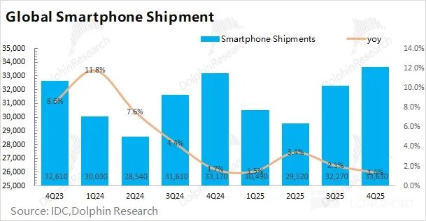 Combining industry data, under the influence of Apple's new phone strategy of "more features at the same price," smartphone shipments (excluding Apple) in the fourth quarter of 2025 were 255 million units, basically flat year-over-year, indicating a rather sluggish Android market.