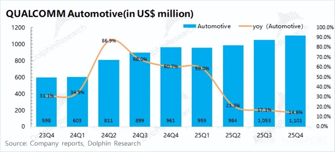 In the first quarter of fiscal year 2026 (equivalent to the fourth quarter of 2025), Qualcomm's automotive business generated revenue of USD 1.1 billion, marking a 14.6% year-on-year increase and aligning with market expectations of USD 1.08 billion. This growth was primarily propelled by a surge in shipments of the Snapdragon Digital Chassis.