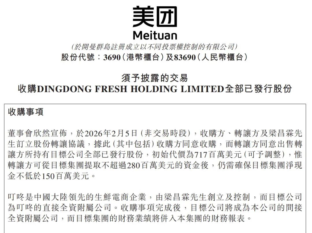 On February 5, 2026, Meituan announced on the Hong Kong Stock Exchange its acquisition of 100% equity in Dingdong Fresh's China operations for an initial consideration of approximately USD 717 million. Post-acquisition, Dingdong Fresh will become an indirectly wholly-owned subsidiary of Meituan, with its financial results consolidated into Meituan's financial statements.
