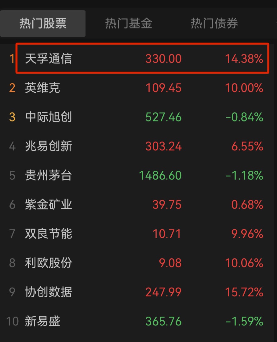 The announcement sparked a robust market response. On February 12, Tianfu Communication's shares opened significantly higher, oscillated upwards throughout the session, peaked at 333.79 yuan per share, and closed at 330.00 yuan per share, surging 14.38% in a single day to reach an all-time high and secure the top spot on Wind's hot stock list for the day.