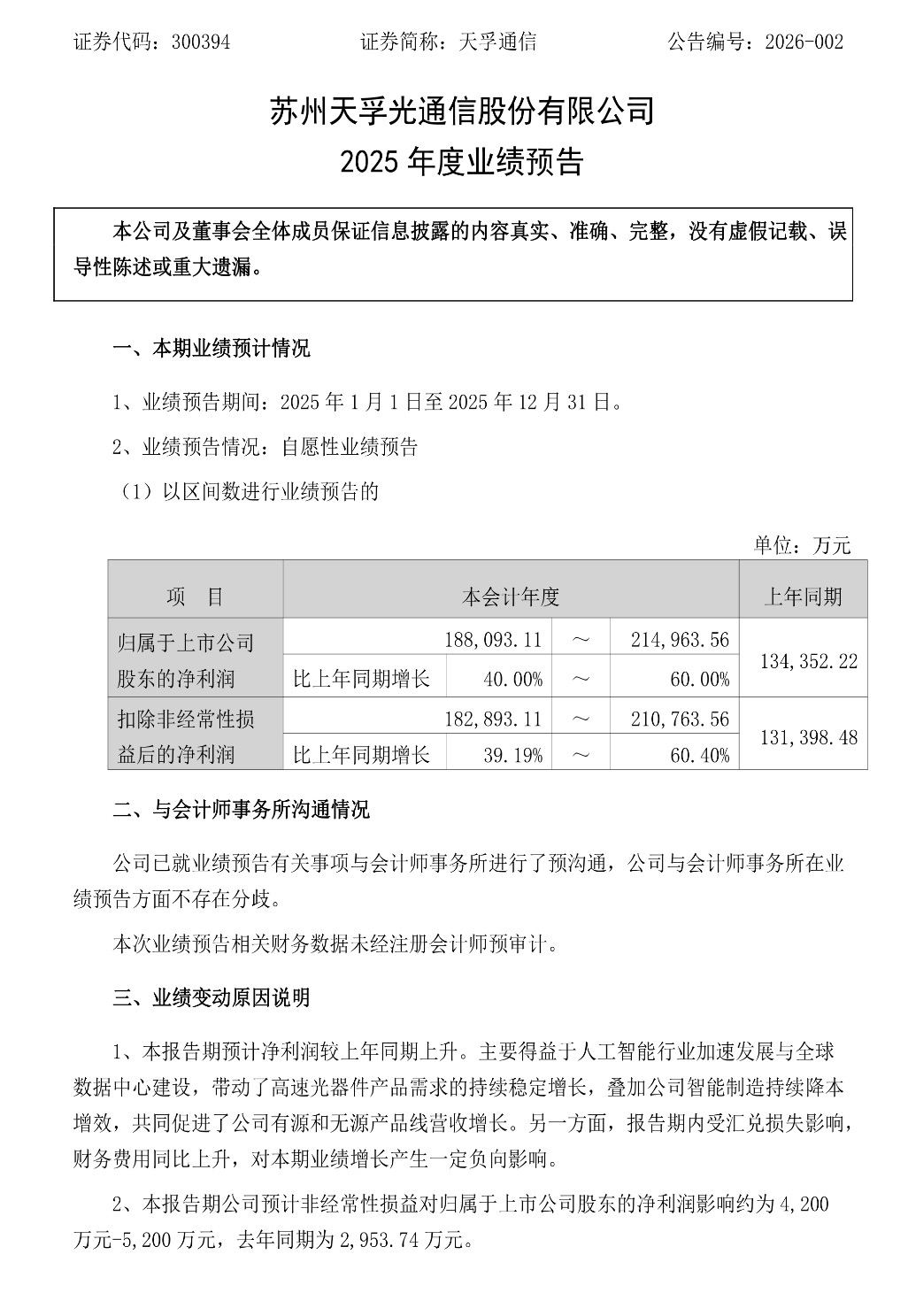 Financially, Tianfu Communication delivered a strong performance. The company's 2025 annual performance preview indicates that full-year net profit attributable to shareholders is expected to range from 1.881 billion yuan to 2.15 billion yuan, representing a year-on-year increase of 40%—60%.