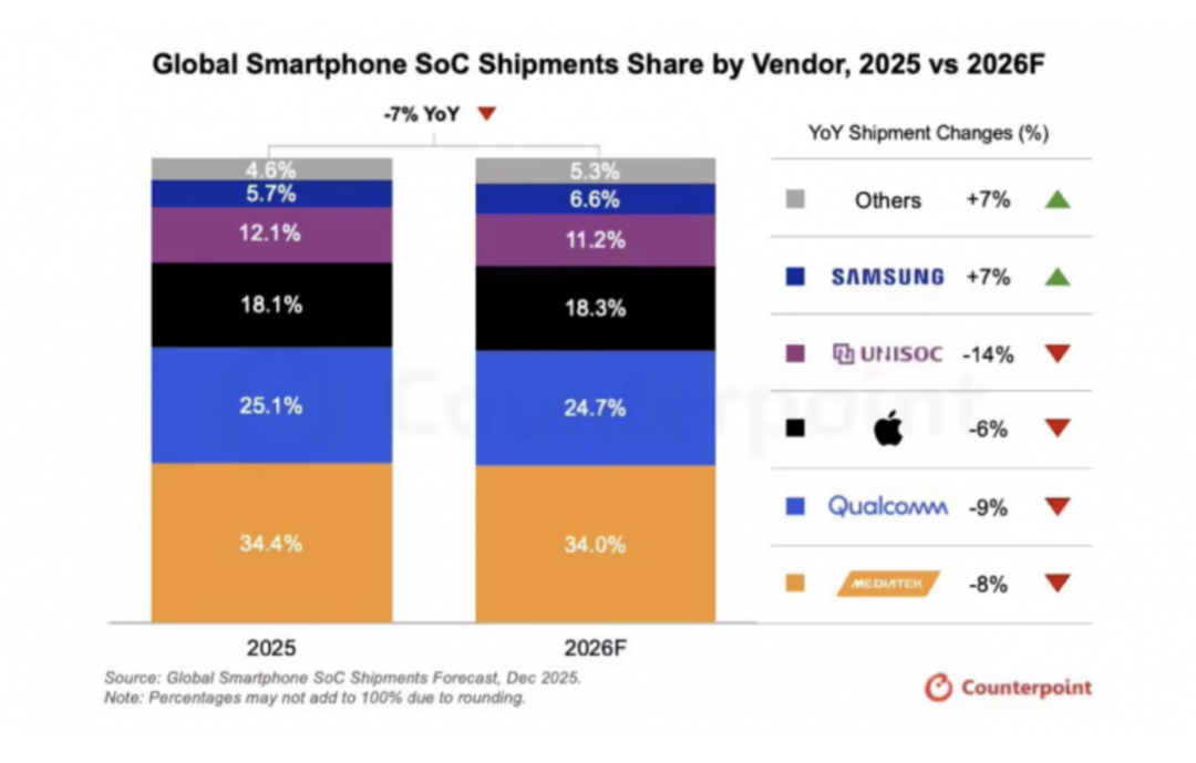 The upstream chip market also signals this trend: Counterpoint predicts that in 2026, MediaTek shipments will decline 8% year-on-year, Qualcomm 9%, and UNISOC—which mainly serves the low-end market—will drop 14%.