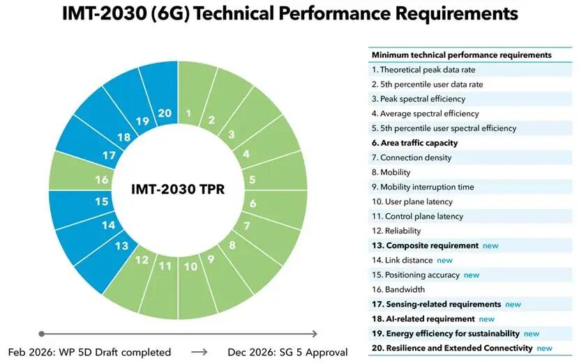 Recently, the International Telecommunication Union (ITU) announced that its Radiocommunication Sector (ITU-R) Working Group 5D has formally finalized the draft performance requirements for IMT-2030 (6G) through consensus in February 2026. The draft, titled "Minimum Technical Performance Requirements for IMT-2030 Radio Interfaces," outlines 20 technical performance requirements (TPRs), including seven new indicators specific to 6G, designed to evaluate future 6G radio interfaces.