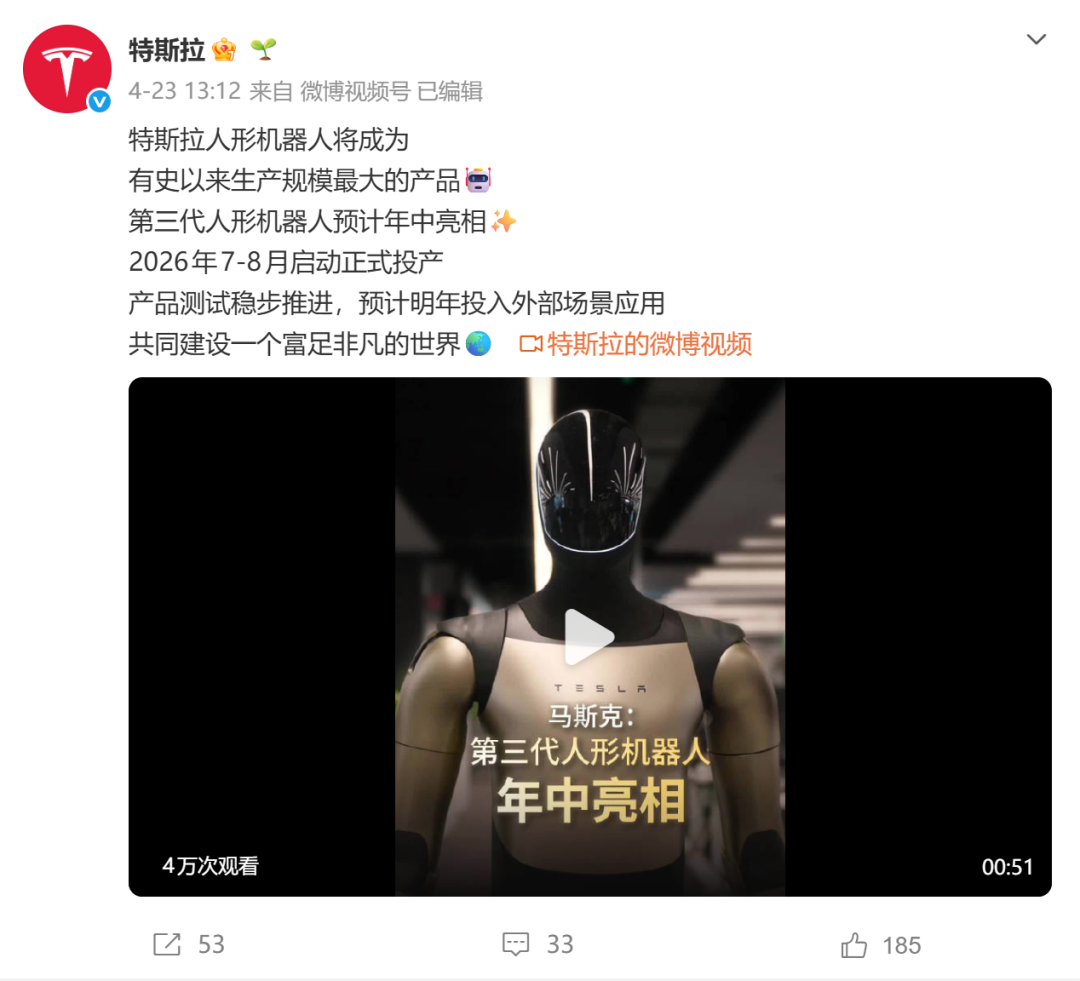 On April 23, Tesla announced via its official Weibo account that the third-generation Optimus (Gen3) is expected to officially debut by mid-year, with plans to initiate large-scale production at its Fremont, California factory between July and August 2026, targeting an annual output of 1 million units.