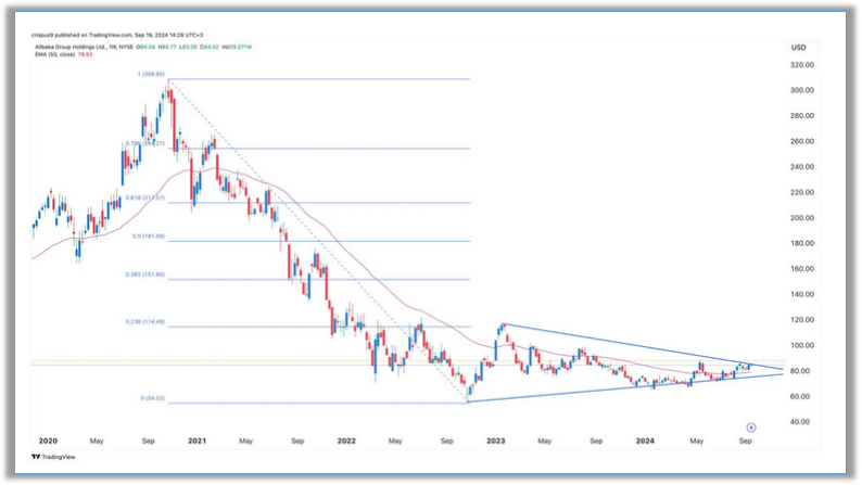 The weekly chart shows that Alibaba's share price has been range-bound for the past few months, forming a symmetrical triangle pattern (highlighted in blue on the chart). However, it has now slightly moved above the upper trendline of the triangle.