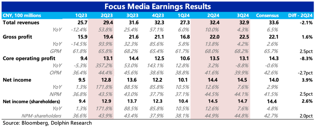 In the third quarter, Focus Media's revenue was RMB 3.29 billion, up 4.3%, falling within the expectations of several leading institutions (RMB 3.2-3.4 billion). The macroeconomic pressures in the second half of the year were evident, leading to corresponding downward adjustments in market expectations.