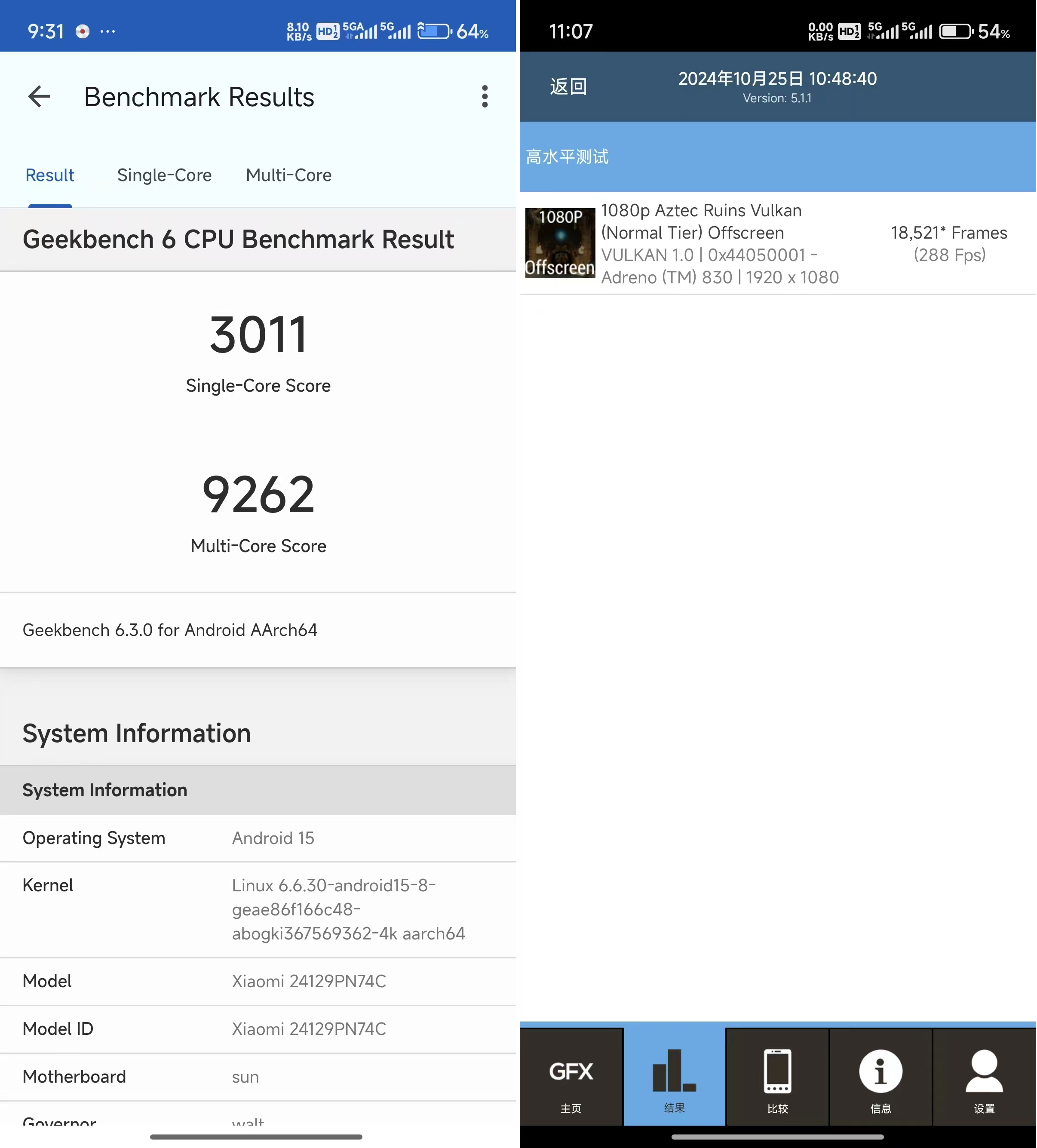 How powerful is this chip? Perhaps we can refer to the benchmark scores of Xiaomi 15 measured by Leikeji: GeekBench 6 single-core score of 3011 and multi-core score of 9262, almost surpassing Apple's A18 Pro.