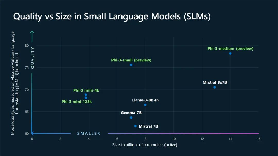 The protagonist on the edge side is the Small Language Model (SLM). SLM refers to lightweight neural network models with fewer than 10 billion parameters. Compared to large models, SLM achieves natural language processing (NLP) with fewer parameters and computational resources (as shown in the image below). Additionally, SLMs are often tailored to specific tasks, applications, or use cases.
