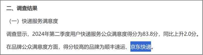 JD.com's high-quality service has always been well-regarded and represents the industry's highest service standard. For example, its subsidiary JD Express provides door-to-door delivery services to all, and its high timeliness and extensive coverage have always been significant advantages. JD Logistics has also been pursuing higher standards on the path of high-quality service. In the past year alone, JD Logistics has set new standards for the industry, including on-demand pick-up and delivery, guaranteed compensation for late evening air shipments, and three major guaranteed compensations. Unsurprisingly, in the National Postal Bureau's satisfaction survey on express delivery services for the first two quarters of 2024, JD Express once again ranked in the first tier with high scores, and its service satisfaction continued to lead the industry.