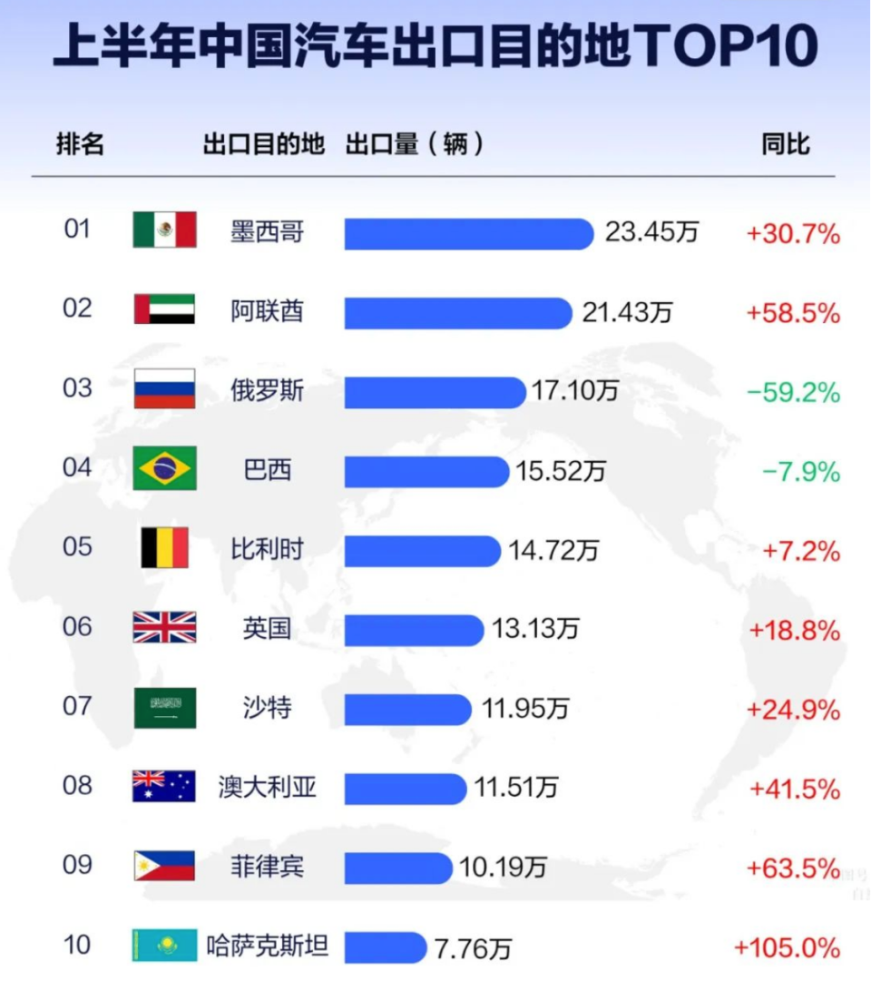 Turbulent changes in the global auto market have sent shockwaves through the export data for the first half of this year. Media statistics for the first half of 2025 reveal a complete reversal in the top three destinations for China's auto exports. Mexico topped the list with 234,500 units, closely followed by the UAE with 214,300 units, while Russia, which had long dominated the top spot, fell to third place with 171,000 units, accompanied by a steep 59.2% year-on-year decline.