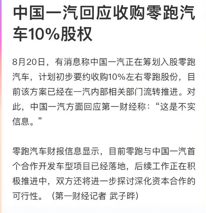 On August 20, Cailian Press reported that China's FAW Group was contemplating acquiring a stake in Leapmotor, initially aiming to tender for approximately 10% of the latter's shares. This plan is currently circulating and being promoted within relevant FAW departments.