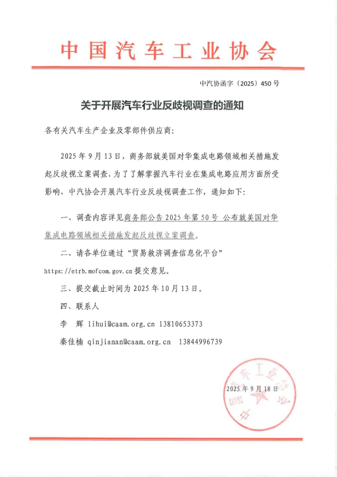 On September 19, the Industry Development Department of the China Association of Automobile Manufacturers (CAAM) released a "Notice on Commencing an Anti-Discrimination Investigation in the Automotive Industry." The notice's core message is that on September 13, 2025, the Ministry of Commerce launched an anti-discrimination investigation into U.S. actions concerning China's integrated circuit industry. In order to comprehend and evaluate the ramifications of these U.S. measures on the automotive industry's use of integrated circuits, the CAAM is undertaking this investigation.