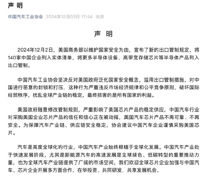 This U.S. move triggered robust countermeasures. On December 3, 2024, the China Association of Automobile Manufacturers, the China Semiconductor Industry Association, the China Internet Association, and the China Communications Enterprise Association jointly issued a statement. They expressed their staunch opposition and urged domestic companies to exercise caution when procuring U.S. chips.